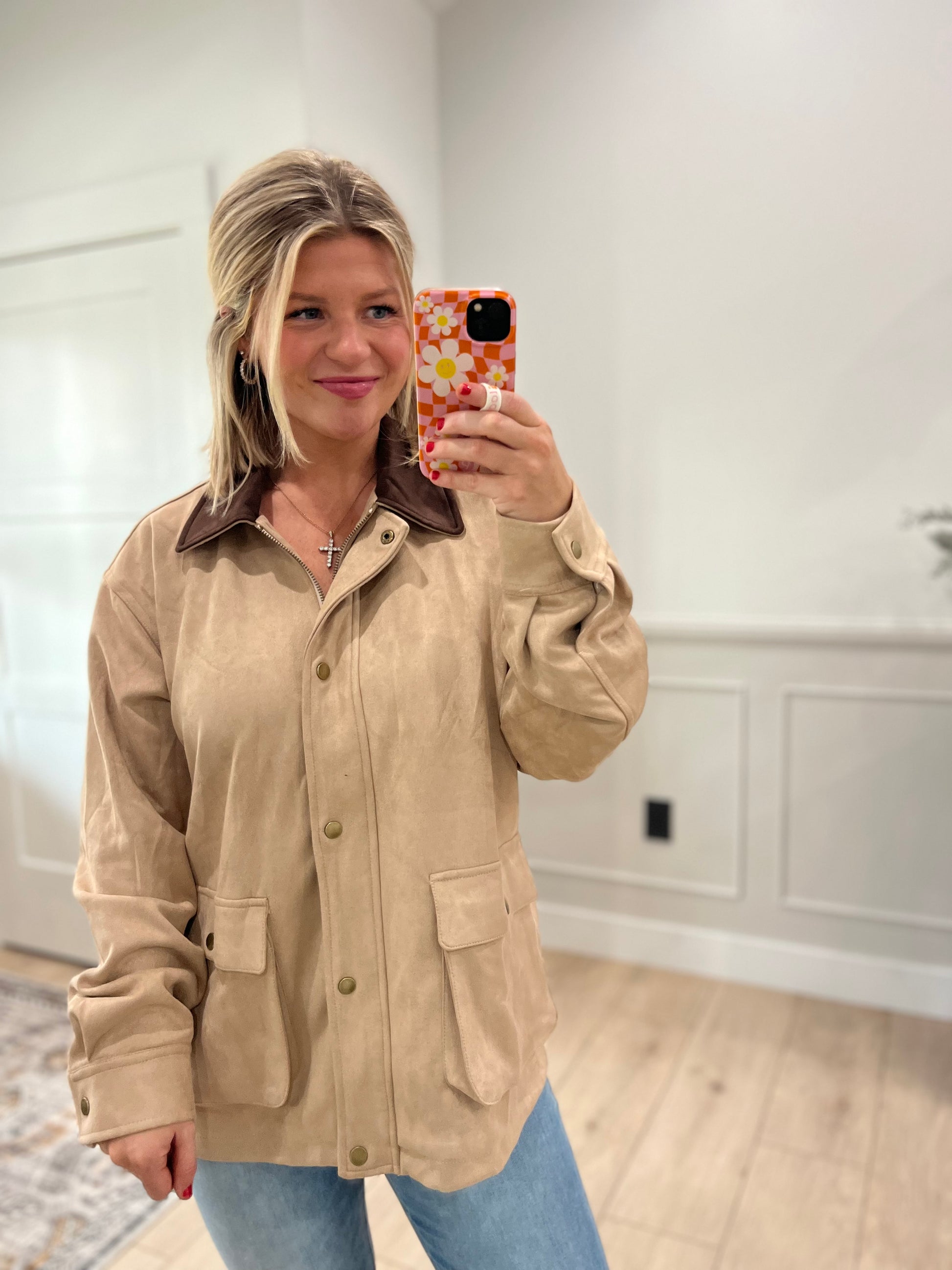 This utility jacket is crafted from a soft, suede fabric that gives it a rich and luxe appearance. Two large, functional pockets adorn the front and a distinctive dark brown collar adds a classic rustic charm. Ultra chic + COMFY! Made from 5% spandex with ultra stretch.