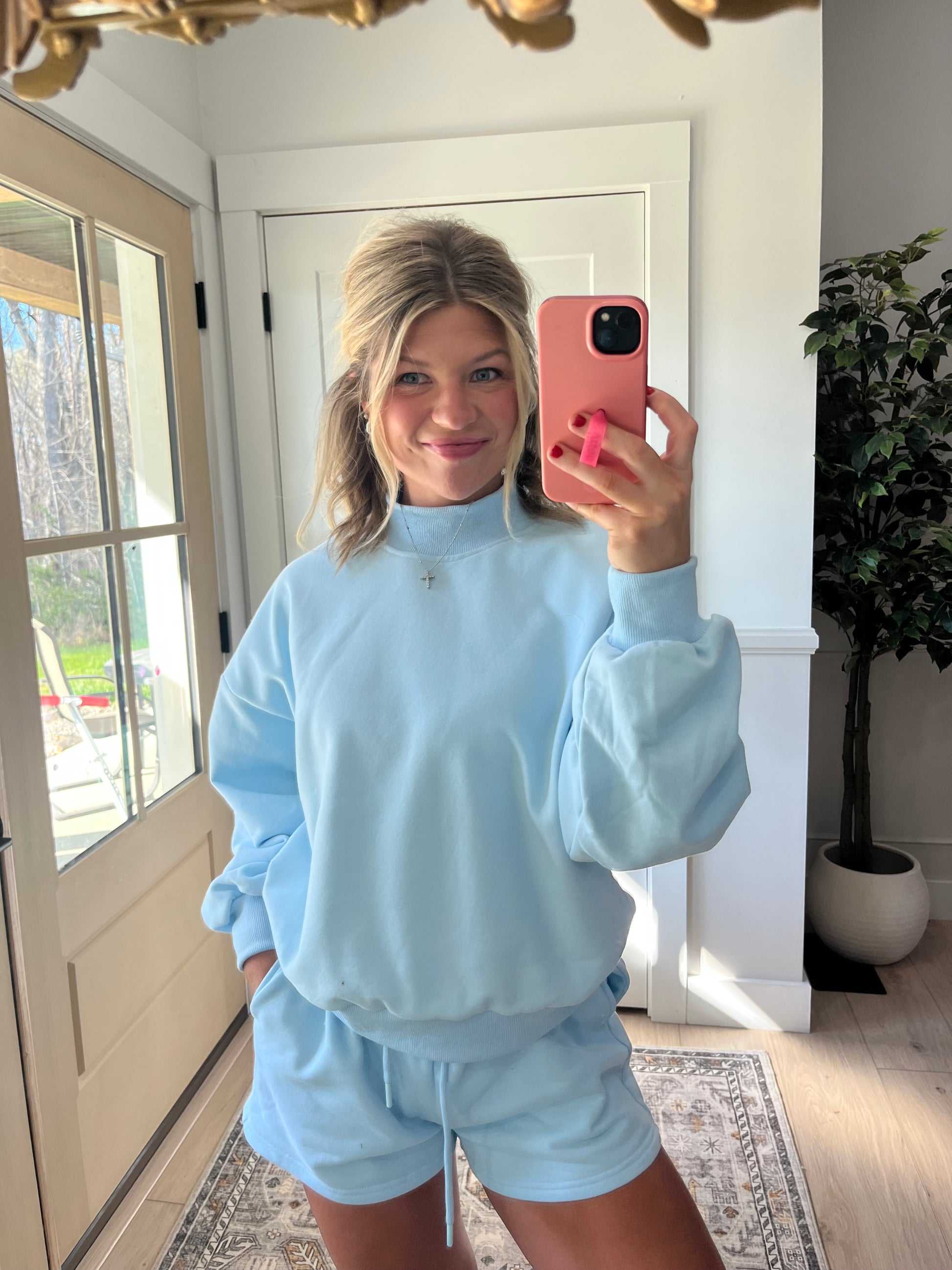 Effortless comfort meets modern minimalism in this oversized lounge set. The relaxed mockneck sweatshirt airs seamlessly with the drawstring shorts for a chic off duty vibe. The soft, cozy fabric makes it perfect for lounging or running errands while the slouchy silhouette adds a streetwear edge. Wear together as a set or mix and match for endless outfit opportunities.