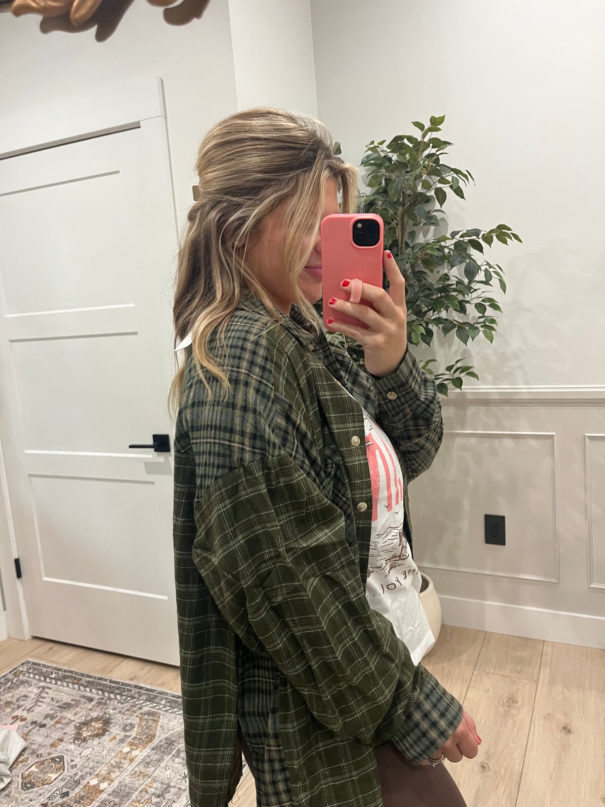Your new favorite layering piece. This frayed-hem flannel brings a lived-in look with an effortlessly comfy fit — perfect for tossing on with denim or leggings + pairs with our graphic tees!