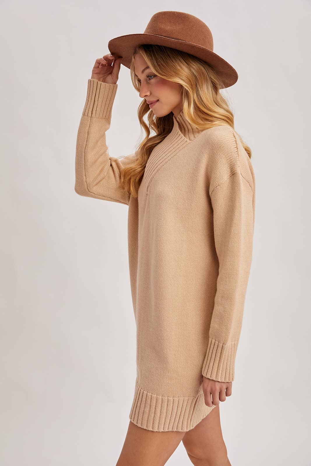 This chic and cozy sweater dress is a perfect blend of sophisticated design and casual ease. Its defining characteristic is the high mock neckline, uniquely designed with a wide, ribbed V-shaped yoke that adds a touch of modern structure and visual interest. The dress falls in a relaxed, straight silhouette for effortless comfort, featuring long sleeves with extended ribbed cuffs and a matching wide ribbed hem.