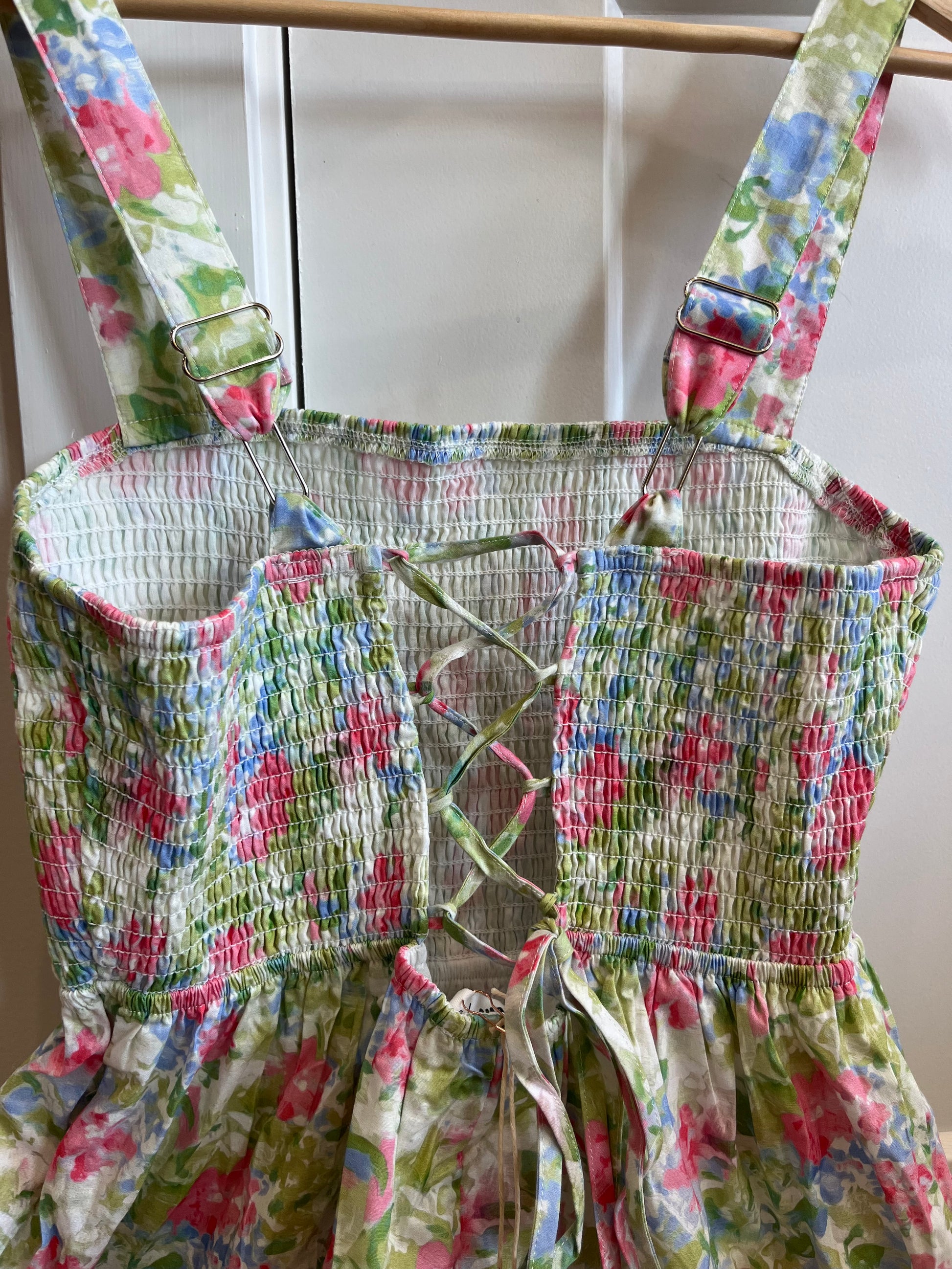 An easy summer dress featuring pretty pastels, a smocked bodice, adjustable shoulder straps, pockets, fully lined and a corset back!