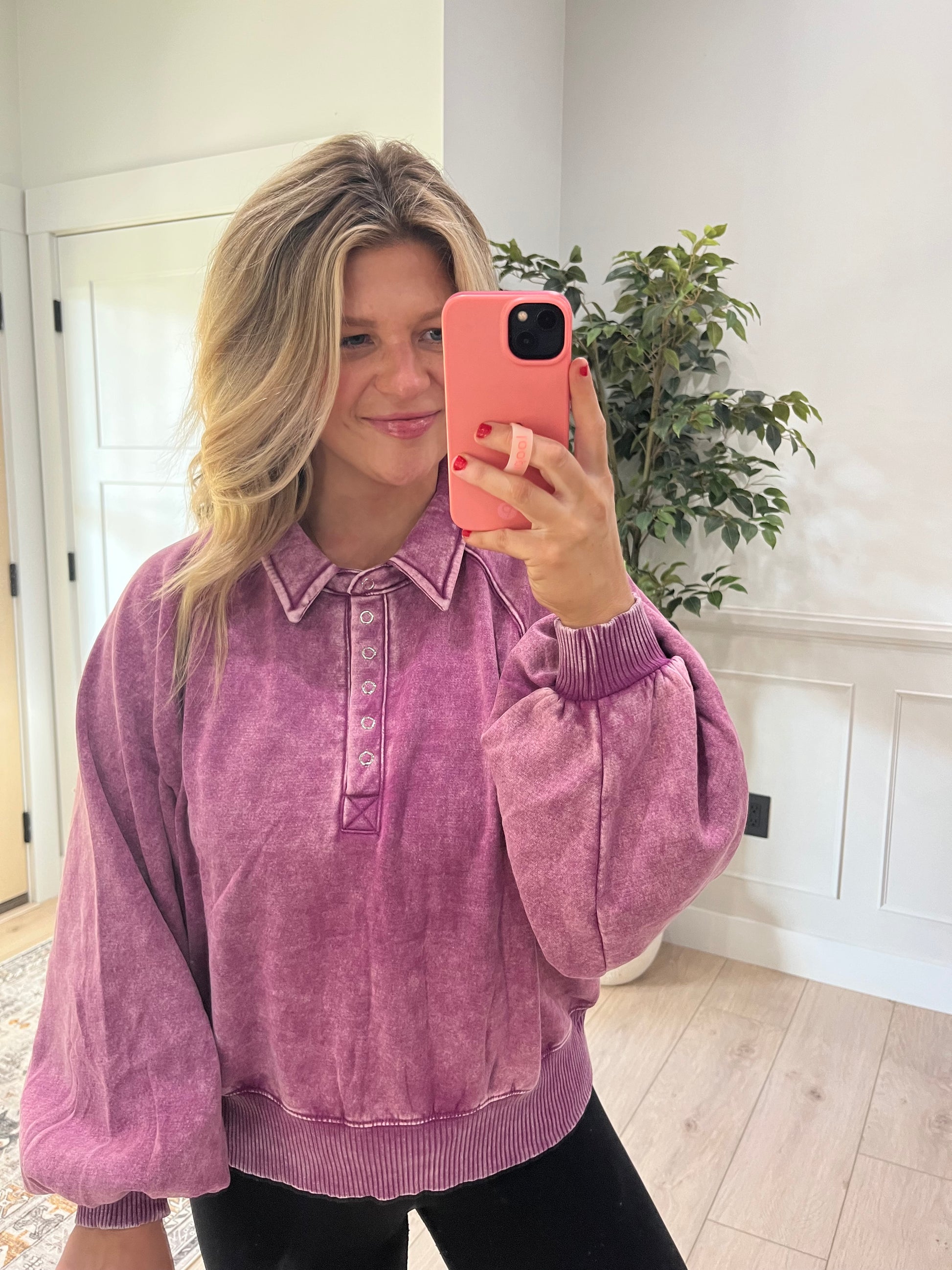 Throw-on-and-go fave! Featuring half-snap detailing and a vintage-inspired wash for the ultimate relaxed vibe. Interior is fleece material.