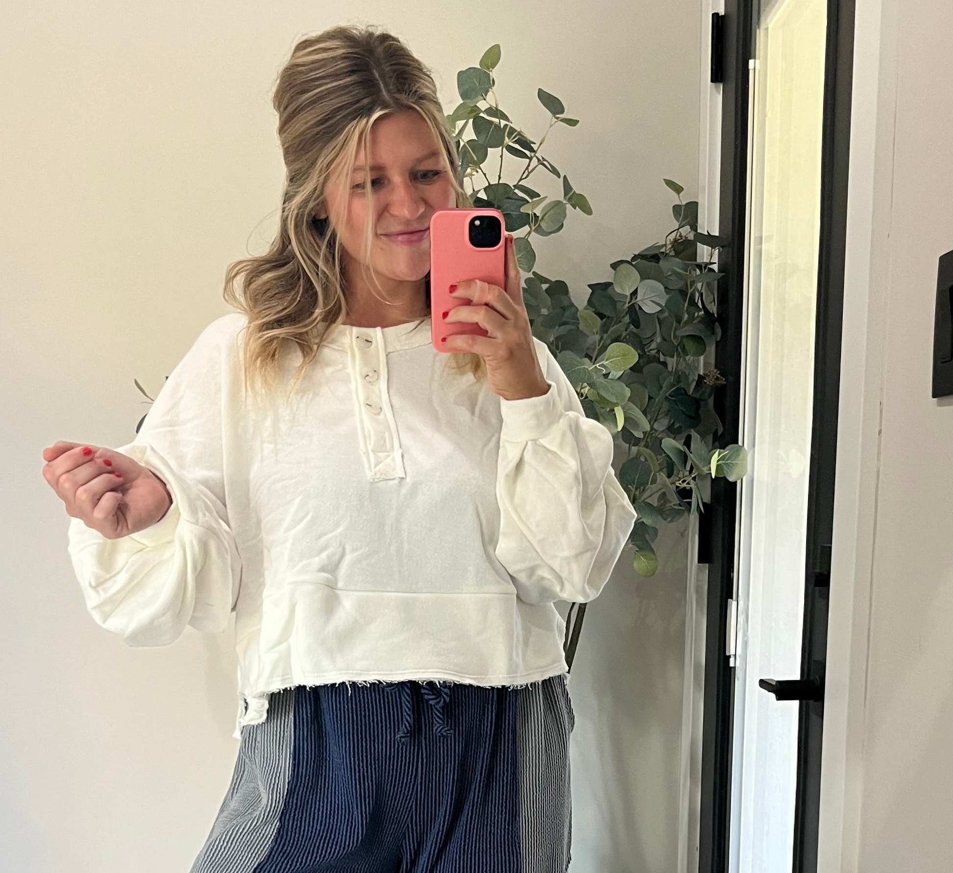 French Terry, Burton up, cropped and frayed hem. All the details combined into 1 top that will pair effortlessly with so many fits!