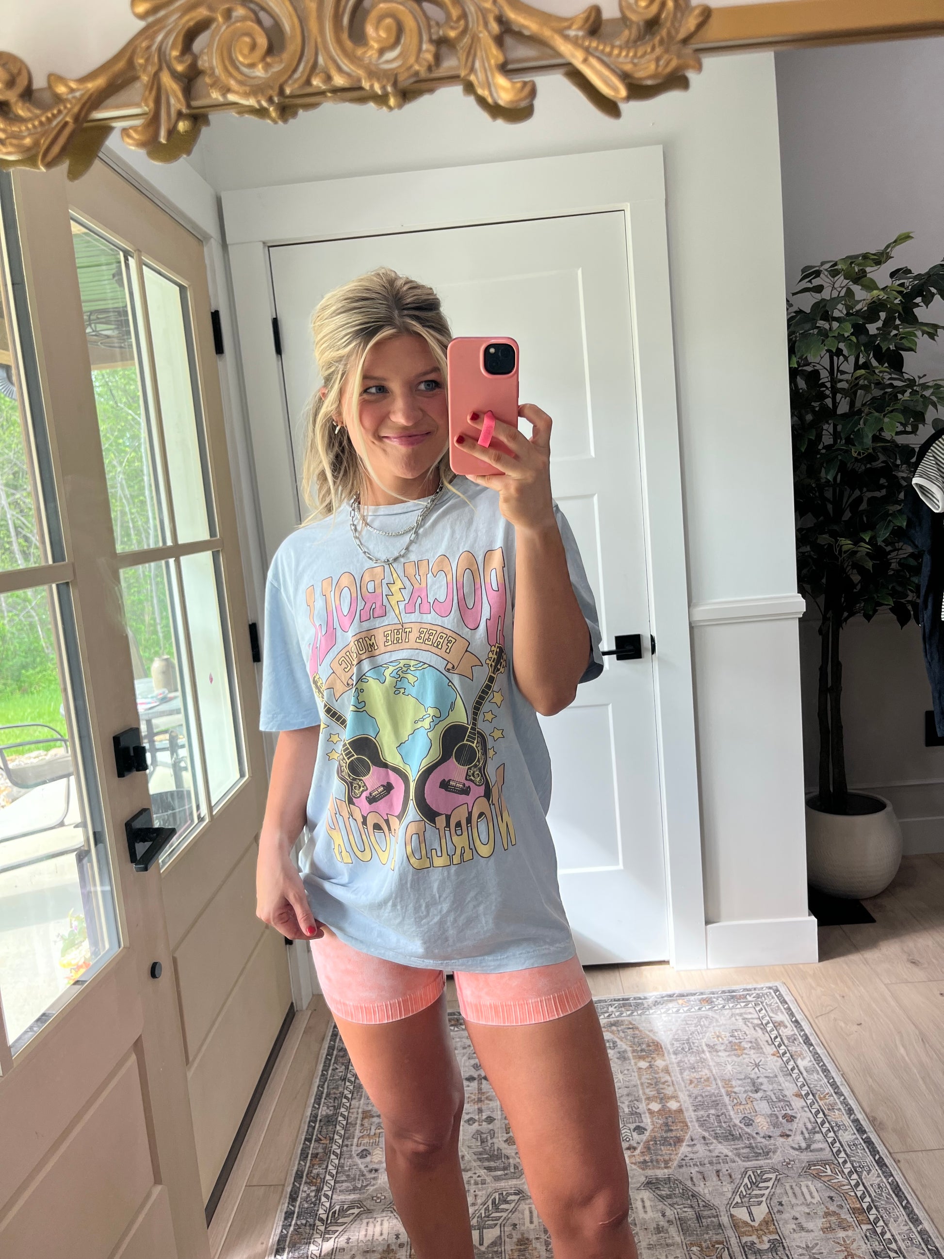 Trendy with a vintage edge. This world tour graphic tee features a gorgeous blue tone and an oversized feel that gives it that effortlessly cool, lived-in look. Easy to throw on and instantly elevate your outfit.