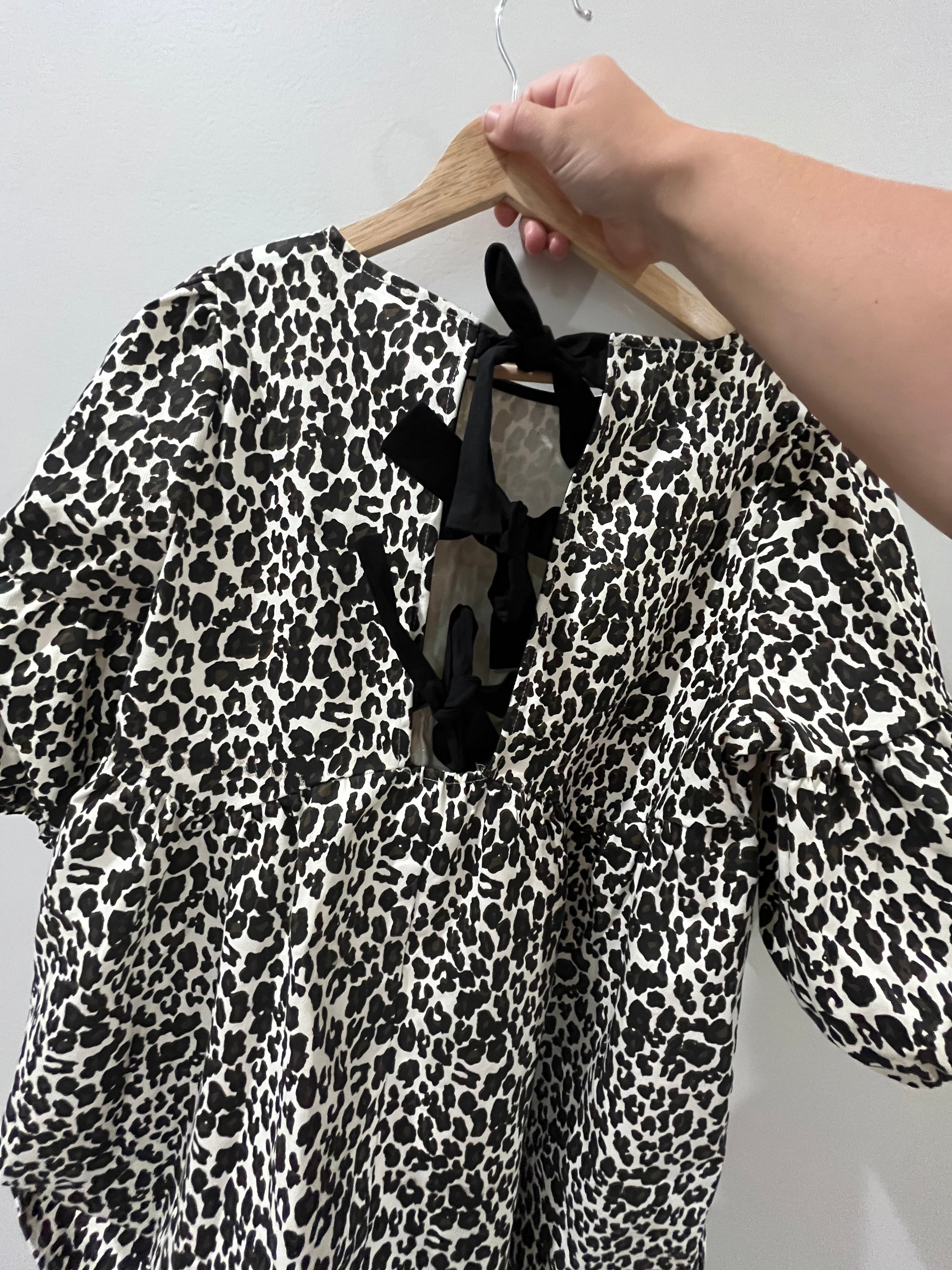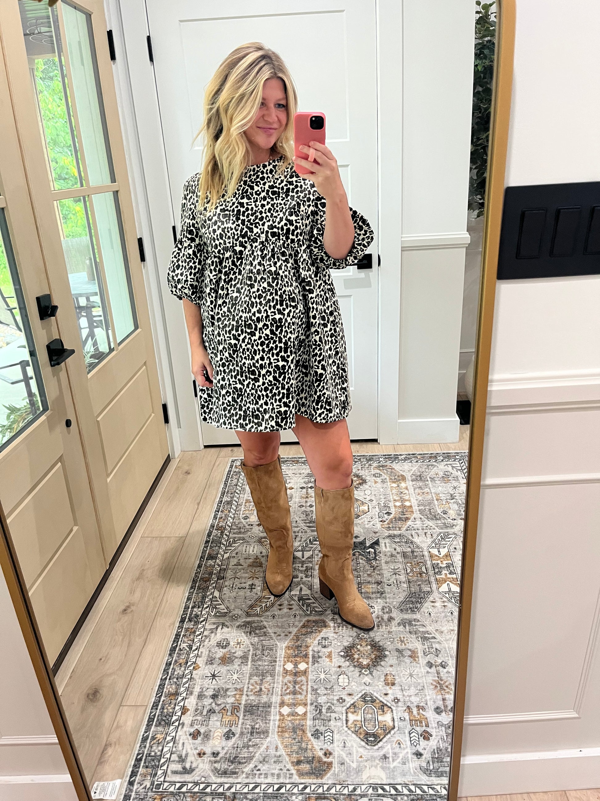 This leopard print denim mini dress with bow tie back detail is sure to upgrade your fall wardrobe! Perfect for any outing - wineries, fests & more! Pairs perfectly with our knee high boots. Dress does run on the larger side; stick to your true size or size down if between sizes.